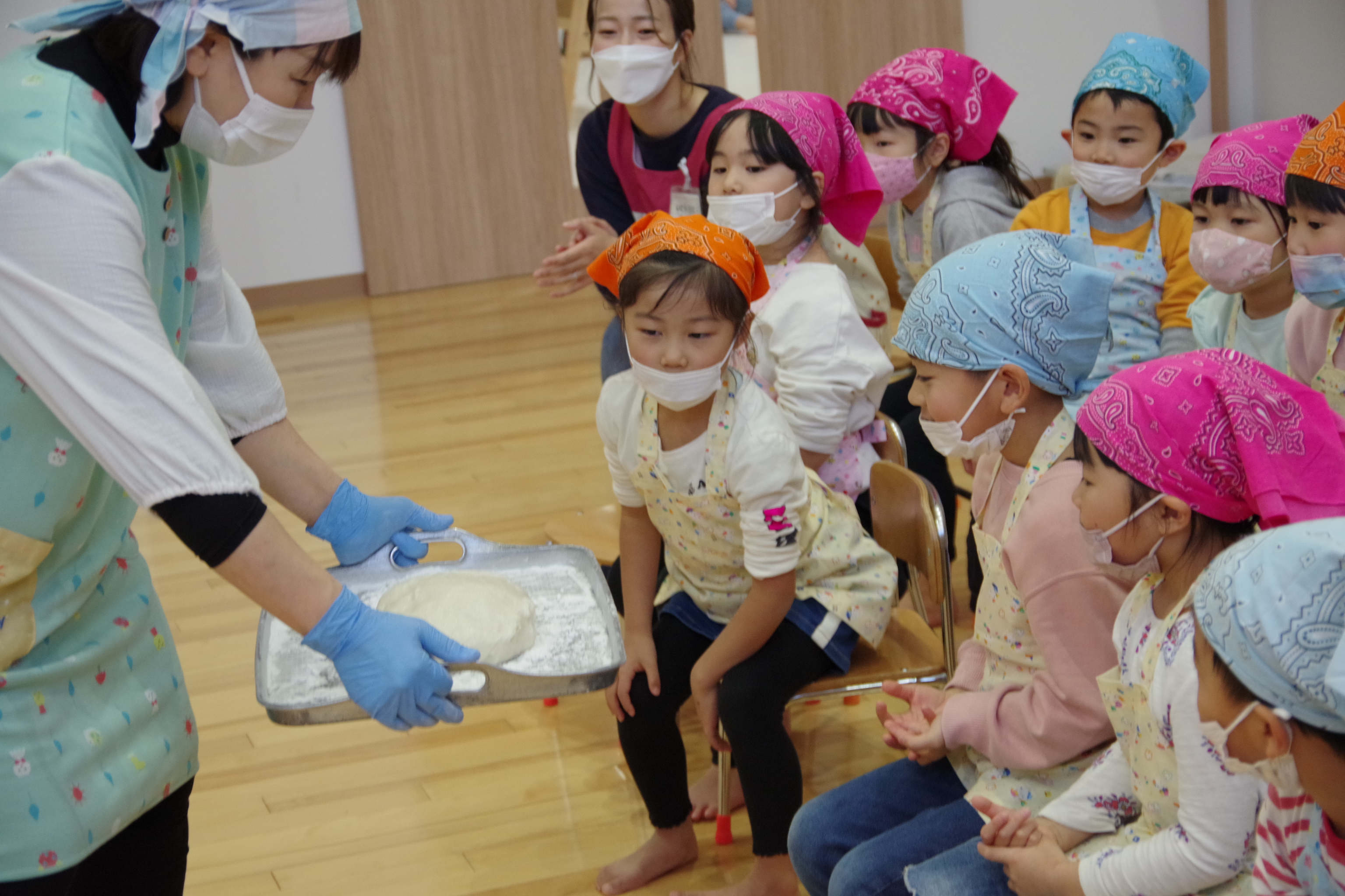 お餅つき会がありました‼ 年長児さんが、お餅つきを体験しました😁 「よいしょ~!」と力強くついていました💪 頑張ってついておもちは、給食のうどんに入れて食べました‼ 「美味しくて、おかわりしたよ‼」と、嬉しそうな子ども達でした😆