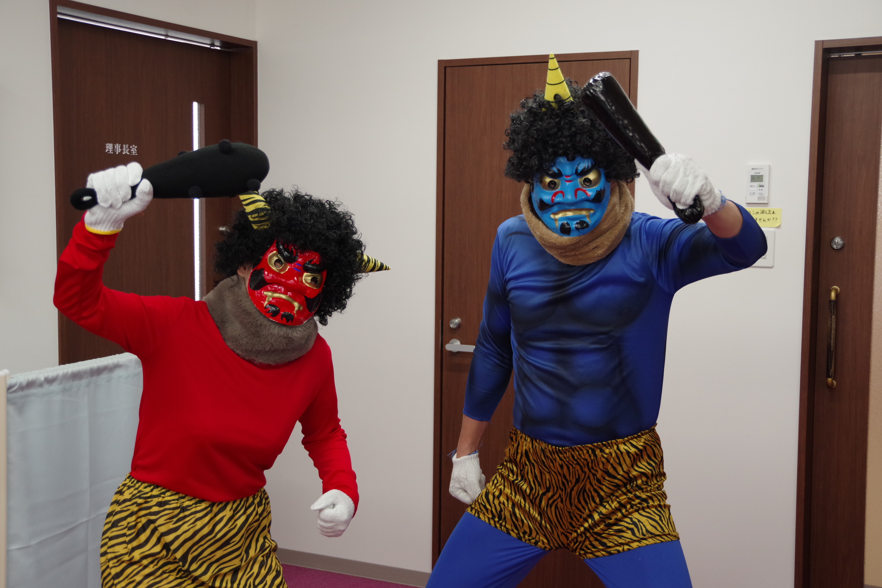感染症拡大防止対策で各クラスでの豆まきとなりましたが、今年も赤鬼と青鬼がやってきました👹
