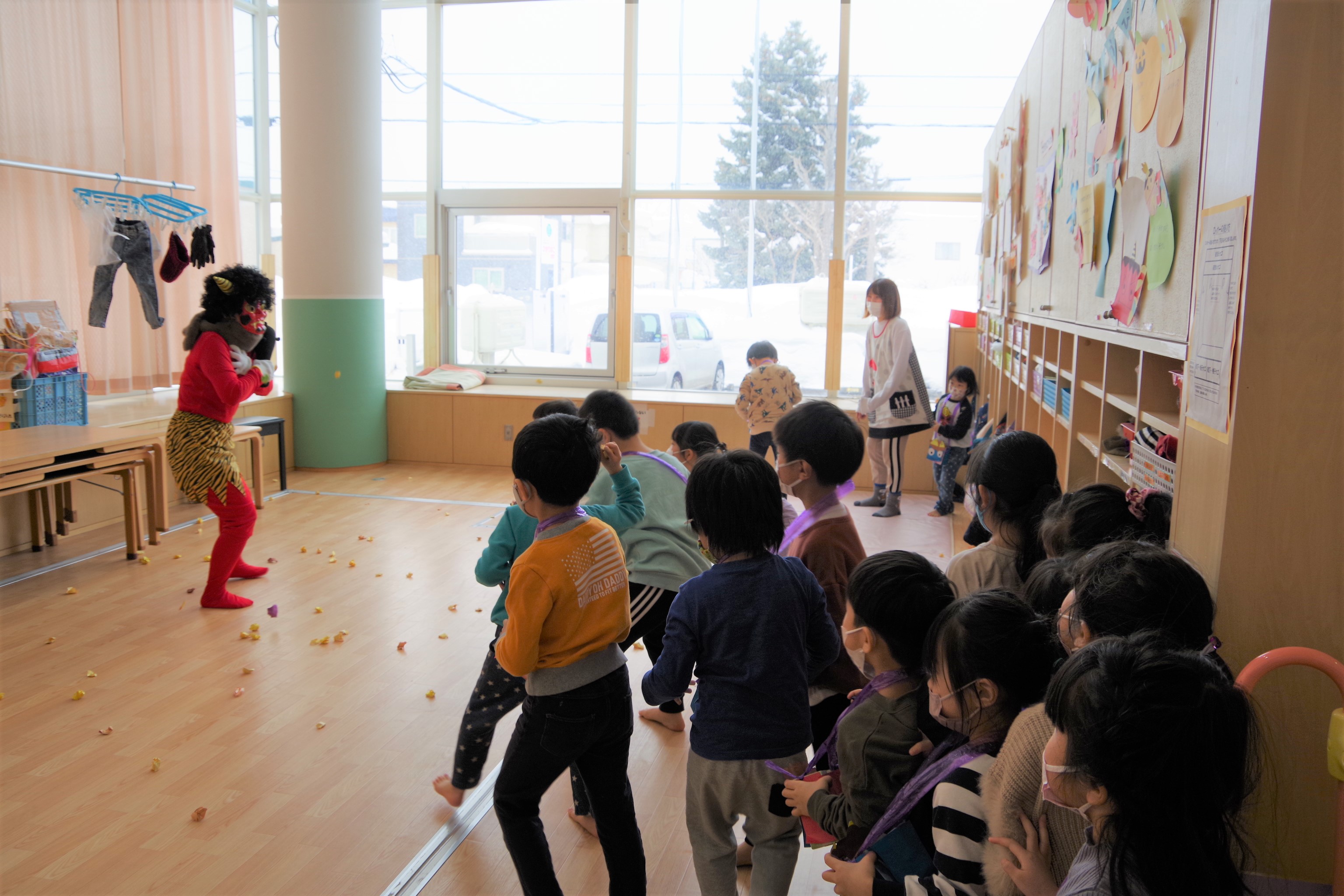 積極的に豆(代わりに画用紙を丸めた玉)を投げる子や先生の後ろに隠れる子等、さまざまでしたが、鬼退治が出来たようです。