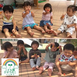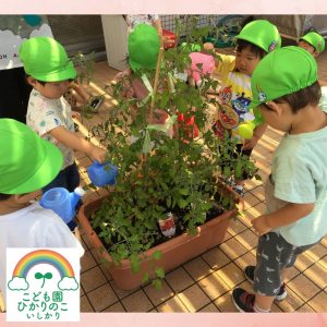 2歳児りす組は、お部屋の前にあるテラスでミニトマト