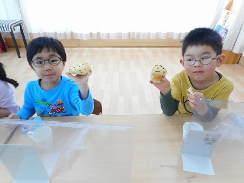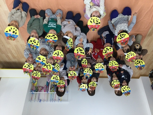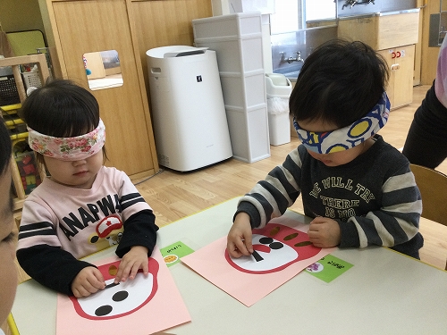 目隠しをして、目や口のパーツの位置を予想し、真剣に、慎重に貼りつけ・・・