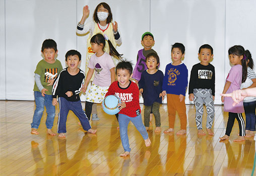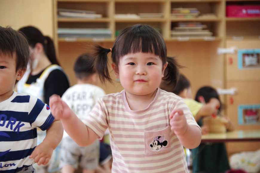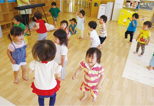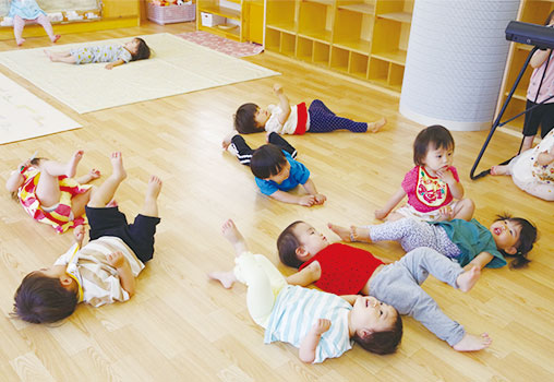 歌あそび、ふれあい遊びはもちろん音に合わせて思いのままに身体を動かすことで友だちや保育教諭と同じ目線で楽しさを共有しています。心身のリラックスと豊かな心を養うことが出来ます。