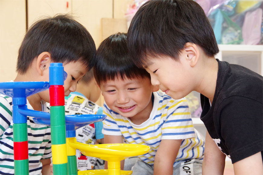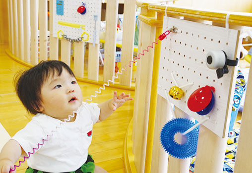 子どもたちの小さな手と足で様々な物や素材に触れ、感触を確かめることで想像力や思考力が高まります。まだ“やりたい”気持ちを存分に楽しめる手作りおもちゃで子どもたちの好奇心を引き出します。