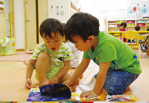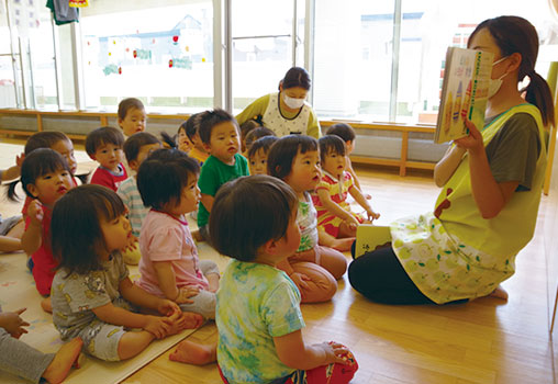 毎日の読み聞かせの中で絵本や紙芝居をじっくり見つめ、読み手の声に聞き入る…想像力が掻き立てられ自然と物語の世界に入り込んでいます。保育教諭と子どもが心を通わせる大切な時間でもあります。