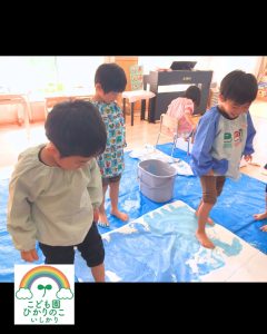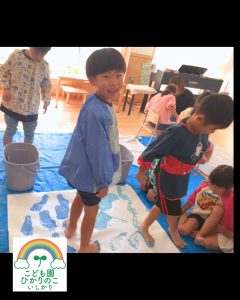 足に絵の具をつけてダイナミックに海を描き🏖️
