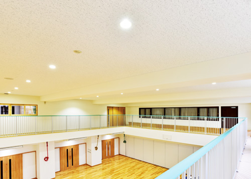 お日さまこぼれる広いベランダや、可動式ステージがあるホールでは